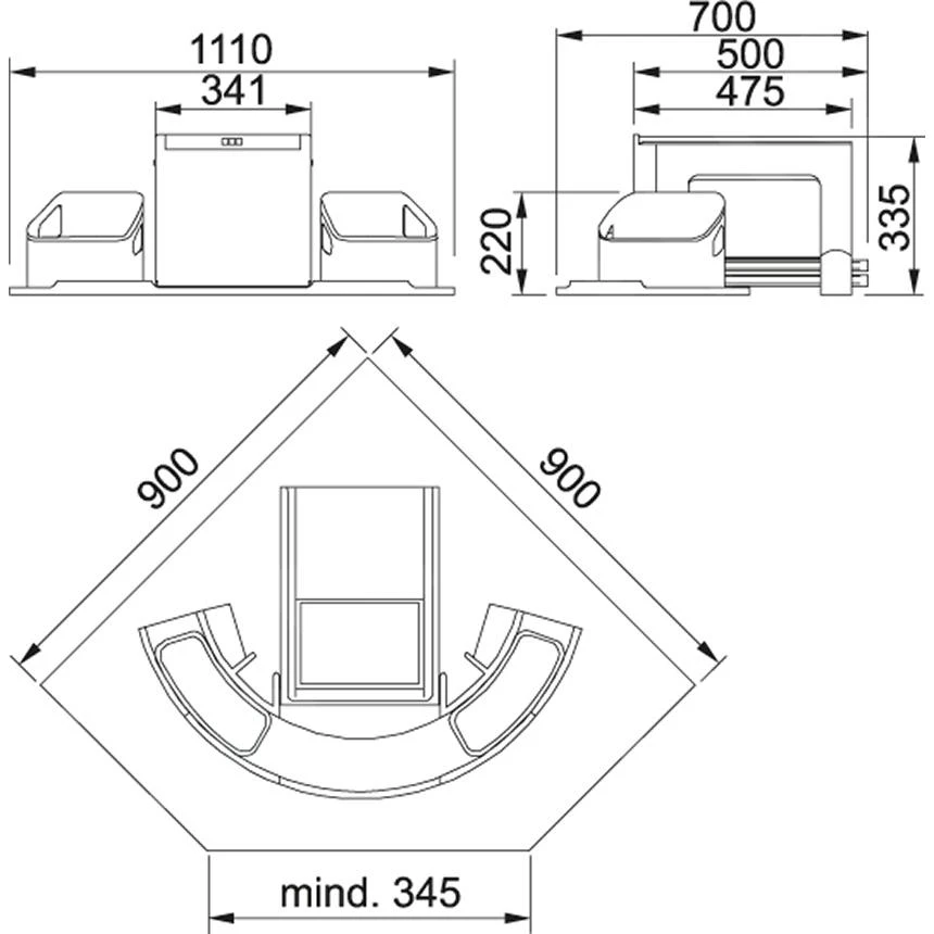 - mueble de esquina inferior a partir de 900 x 900 mm o 1050 x 1050 mm