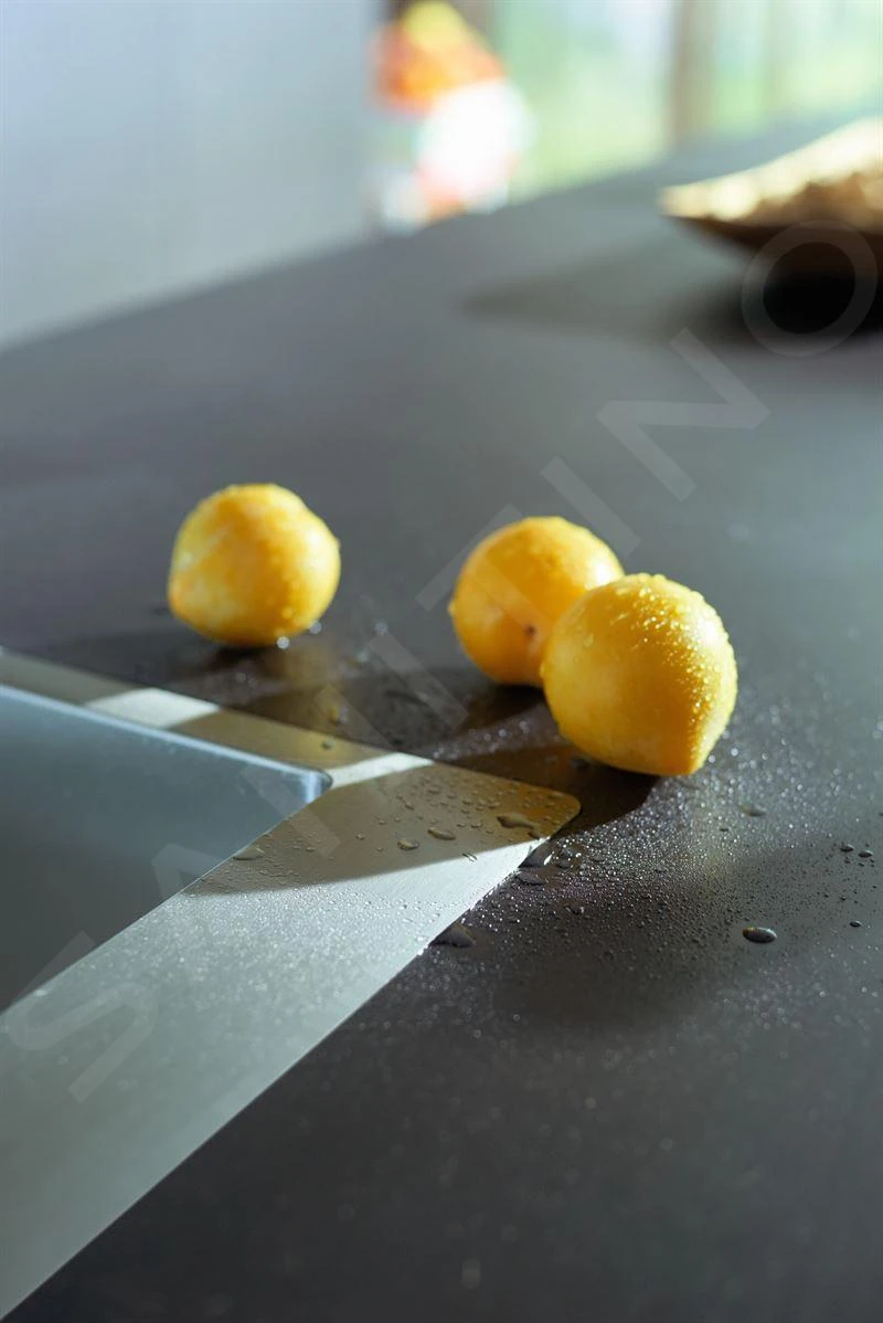 El fregadero está soldado a mano, gracias al acero inoxidable de 1 mm de espesor y a la parte reforzada para montar el grifo es muy estable. El acero inoxidable no sólo es fuerte, sino también resistente a sustancias agresivas como los ácidos de la fruta, además de ser resistente a la corrosión, higiénico y capaz de soportar altas temperaturas. La instalación empotrada crea una transición continua entre el fregadero y la encimera. El rebosadero está discretamente colocado en la parte lateral. El fregadero tiene un diseño minimalista y, gracias a sus bordes precisos y esquinas redondeadas, se convierte en un accesorio de cocina de calidad que servirá durante muchos años.